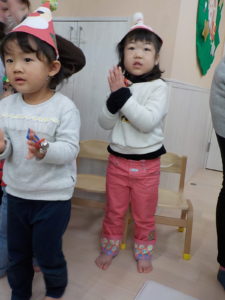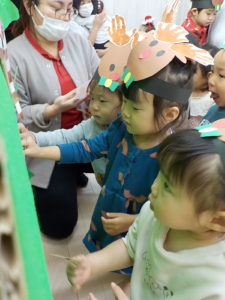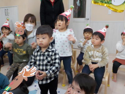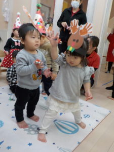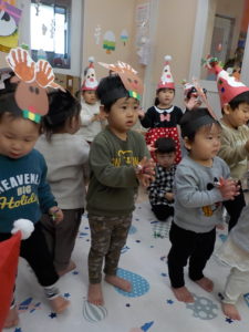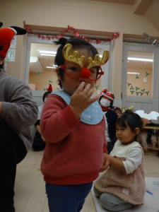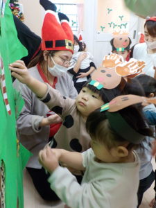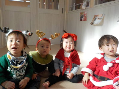 クリスマスにワクワクの子どもたちは、、、、トナカイやさんたさんになって、クリスマス会に参加しました!!