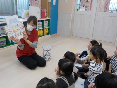 果物屋さんで売っている食べ物には「あるある」、売っていないものには「なーい!」とみんなで声を合わせて言います。
