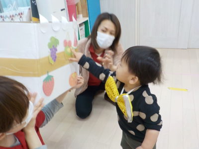いつも英語教室で楽しんでいる「Let’ s go shopping」の歌に合わせて、一人ずつお買い物に行きました。