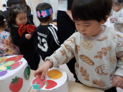 みんなでケーキの飾り付けをしました。