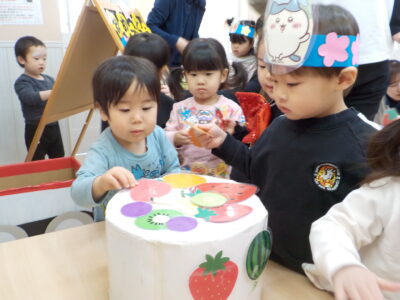 みんなでケーキの飾り付けをしました。