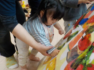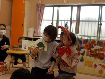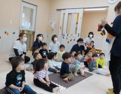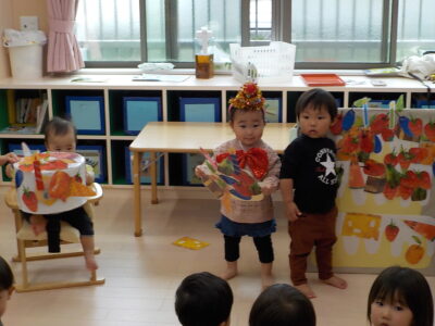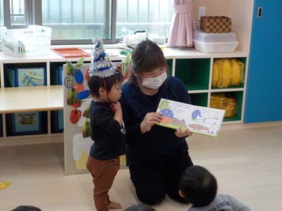 さて、今日は4月生まれの子のお誕生日会をしました。トントントントンあんぱんまんの手遊びをしたあと、はらぺこあおむしのエプロンシアター開幕🐛