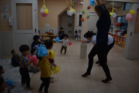 BGMにマツケンサンバが流れると踊り始める子どもたちと先生。