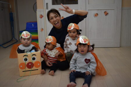 ハロウィンの絵本を見たあと、お菓子をもらいに行きました。