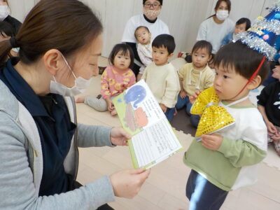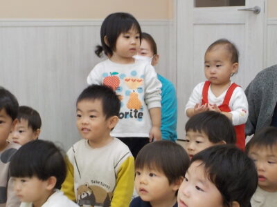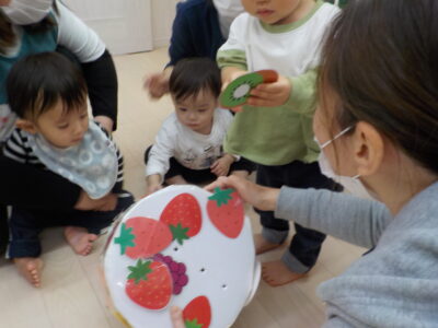 ここしあ保育園では、11月生まれのお誕生日会がありました。赤やオレンジ、黄色など色々な色の風船が出てきました。一体何に変身するのかなー??「赤い風船るるる~そっつとかぜにあげたらふわふわ~ふわふわ~あかいりんごになった🎵」