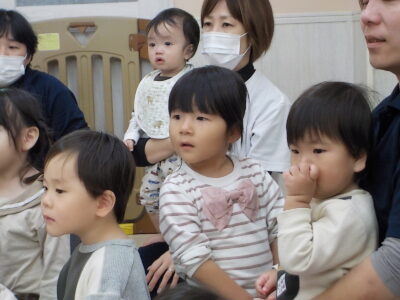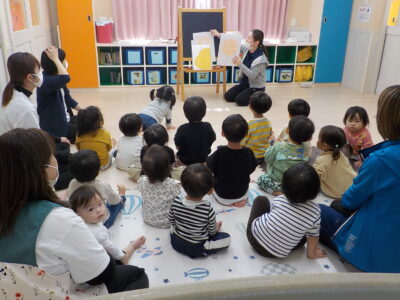 ここしあ保育園では、11月生まれのお誕生日会がありました。赤やオレンジ、黄色など色々な色の風船が出てきました。一体何に変身するのかなー??「赤い風船るるる~そっつとかぜにあげたらふわふわ~ふわふわ~あかいりんごになった🎵」