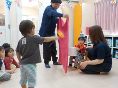 ハロウィンの絵本を見たあと、お菓子をもらいに行きました。