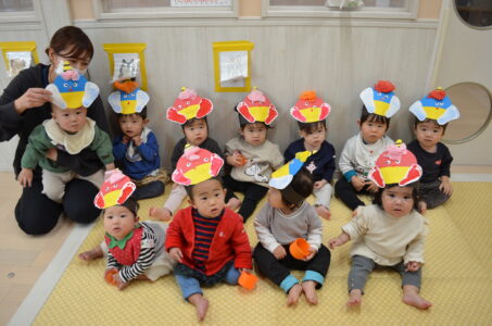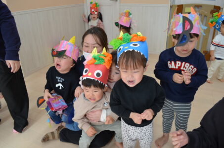 豆まきの歌を歌ったり、オニのパンツを元気良く踊ったりしました。「オニは外!!」の掛け声がとっても上手でした!